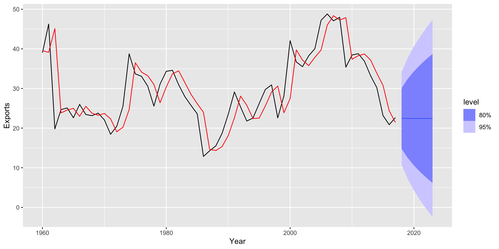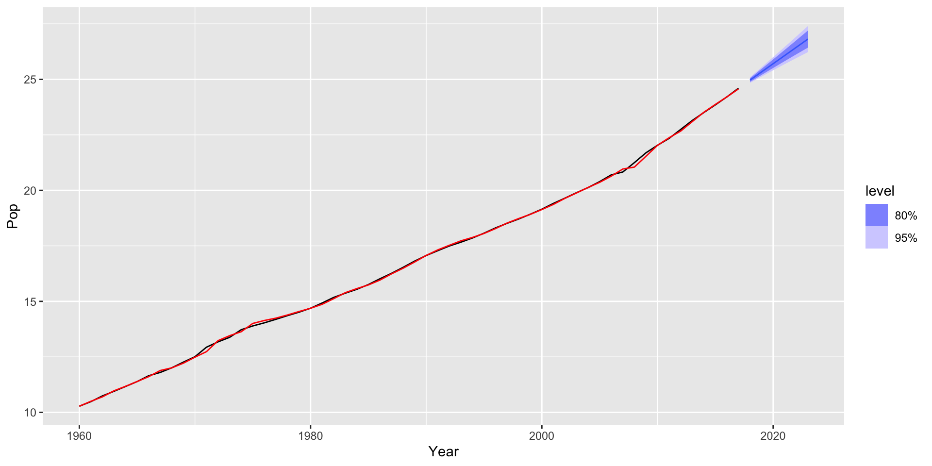 holt(y = australia_economy_ts, h = 6, damped = TRUE, initial = "optimal")