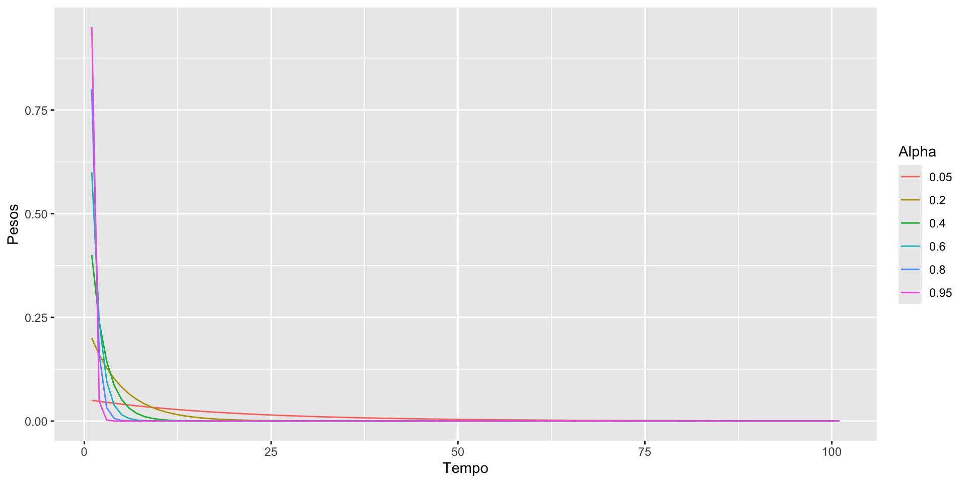 ggplot(dados) + geom_line(aes(x = Tempo, y = Pesos, color = Alpha))O peso que recebem as observações mais antigas cai rapidamente.
