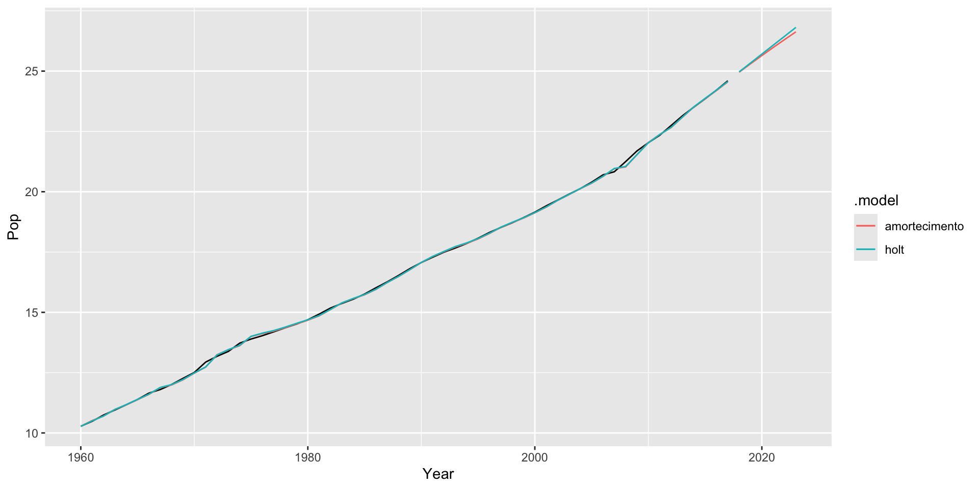 Quando a tendência é exponencial, podemos usar o argumento exponential = TRUE na função holt().