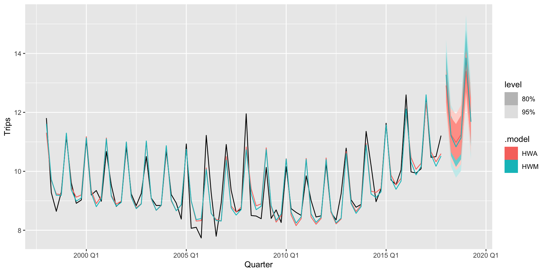 hw(y = aus_holidays_ts, h = 6)