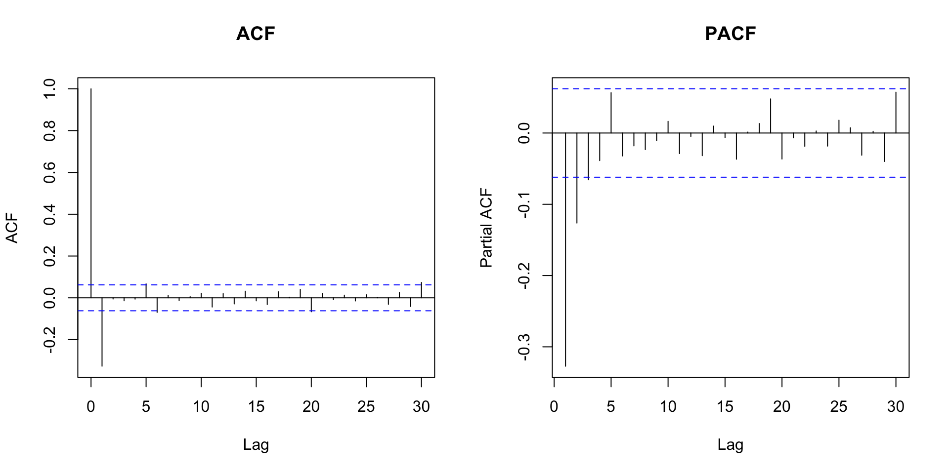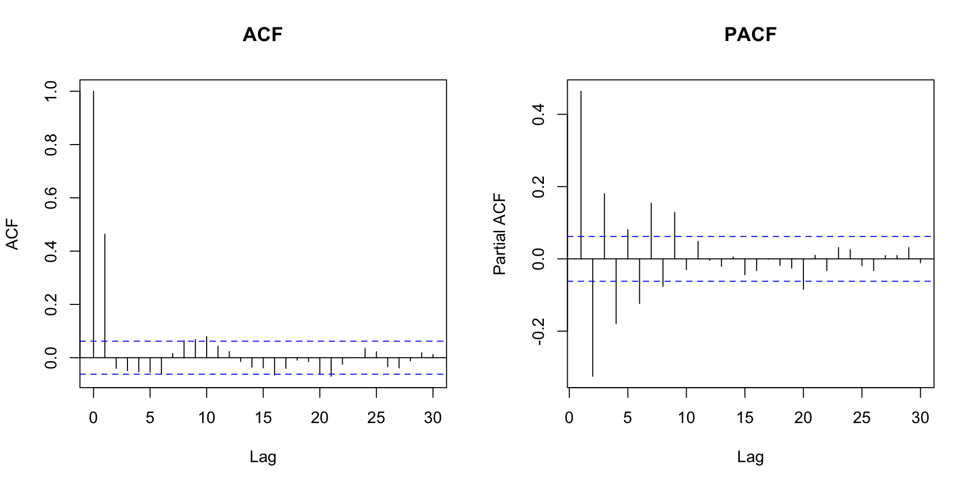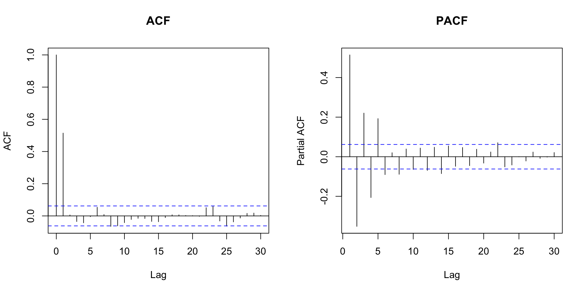 Em geral, a PACF para um MA(q) tem o comportamento de uma mixtura de decaimentos exponenciais ou de ondas senoidais amortecidas.