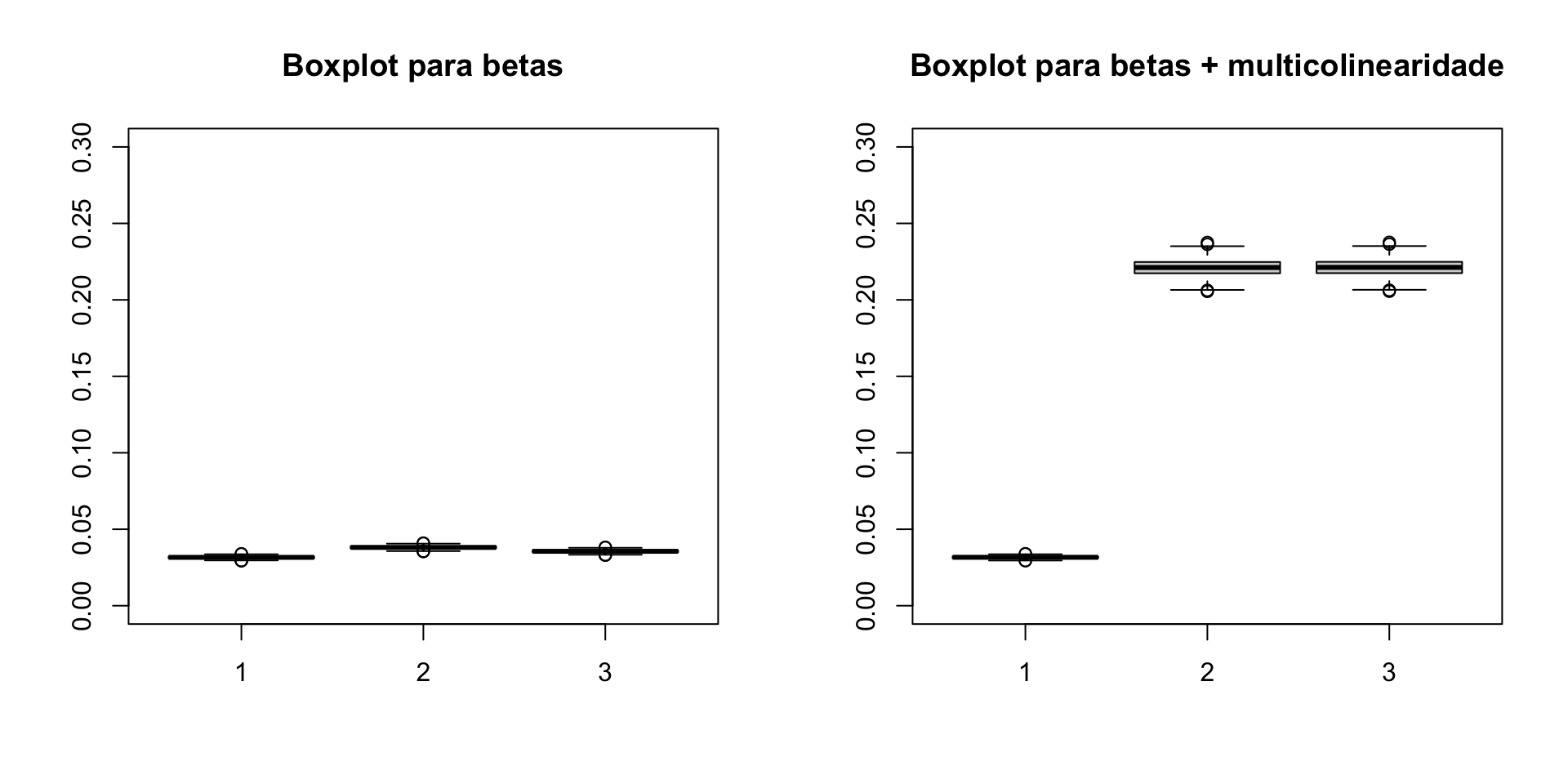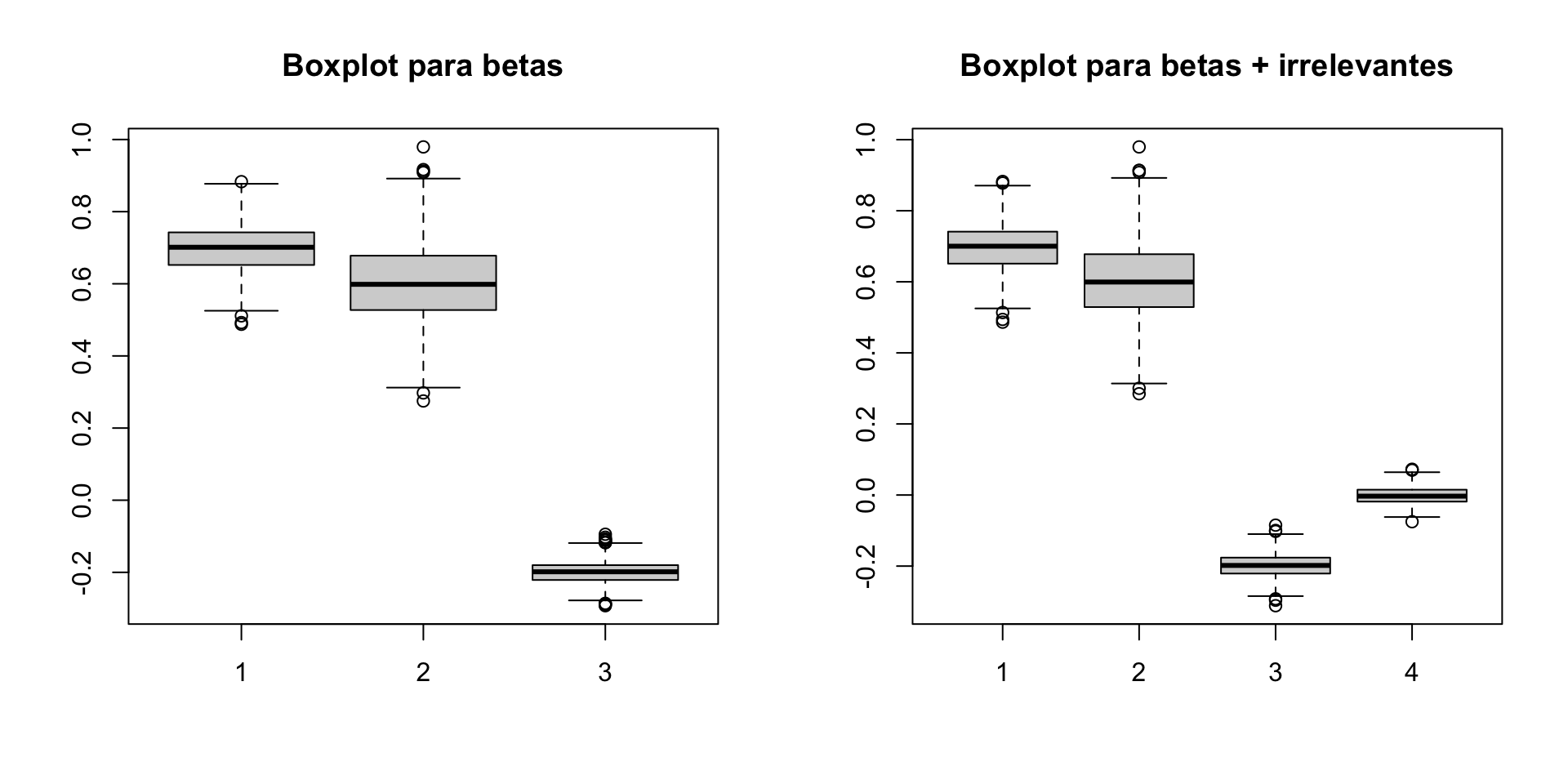 library(MASS)n <-1000betas <-matrix(NA, ncol =3, nrow =1000)betas_i <-matrix(NA, ncol =4, nrow =1000)for (i in1:1000) { u <-rnorm(n) x1 <-runif(n) x <-mvrnorm(n, mu =c(0,0), Sigma =matrix(c(1, 0.5, 0.5, 2), 2, 2)) x2 <- x[,1] x3 <- x[,2] y <-0.7+0.6*x1 -0.2*x2 + u betas[i, ] <-coef(lm(y ~ x1 + x2)) betas_i[i, ] <-coef(lm(y ~ x1 + x2 + x3))}par(mfrow =c(1, 2))boxplot(betas)title("Boxplot para betas")boxplot(betas_i)title("Boxplot para betas + irrelevantes")