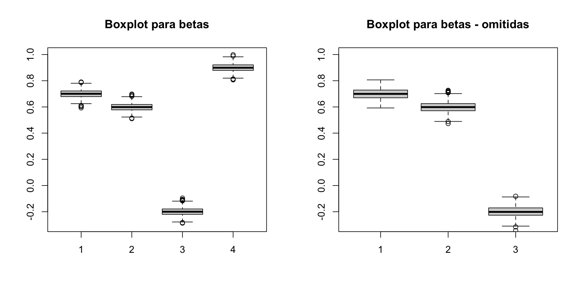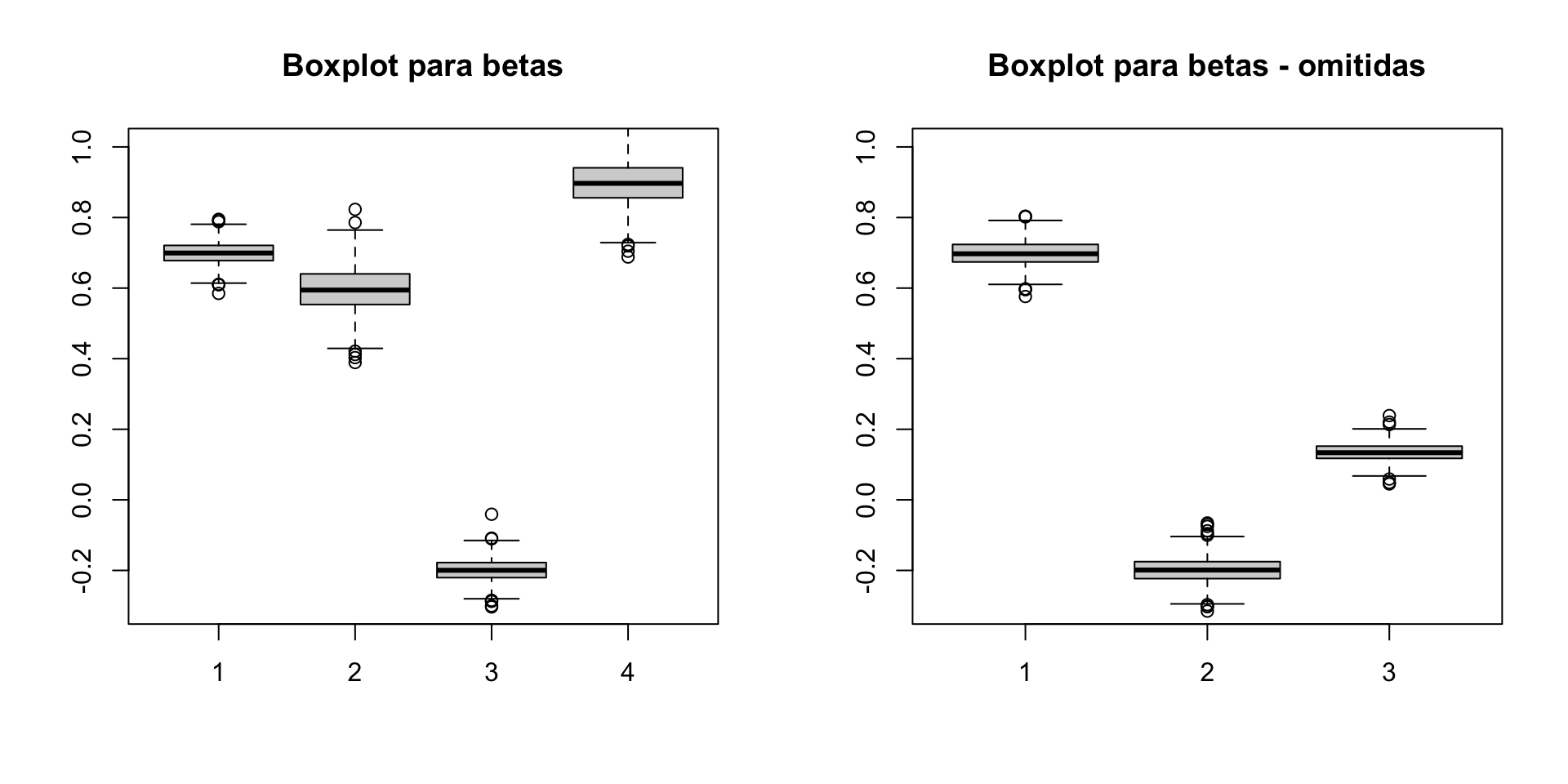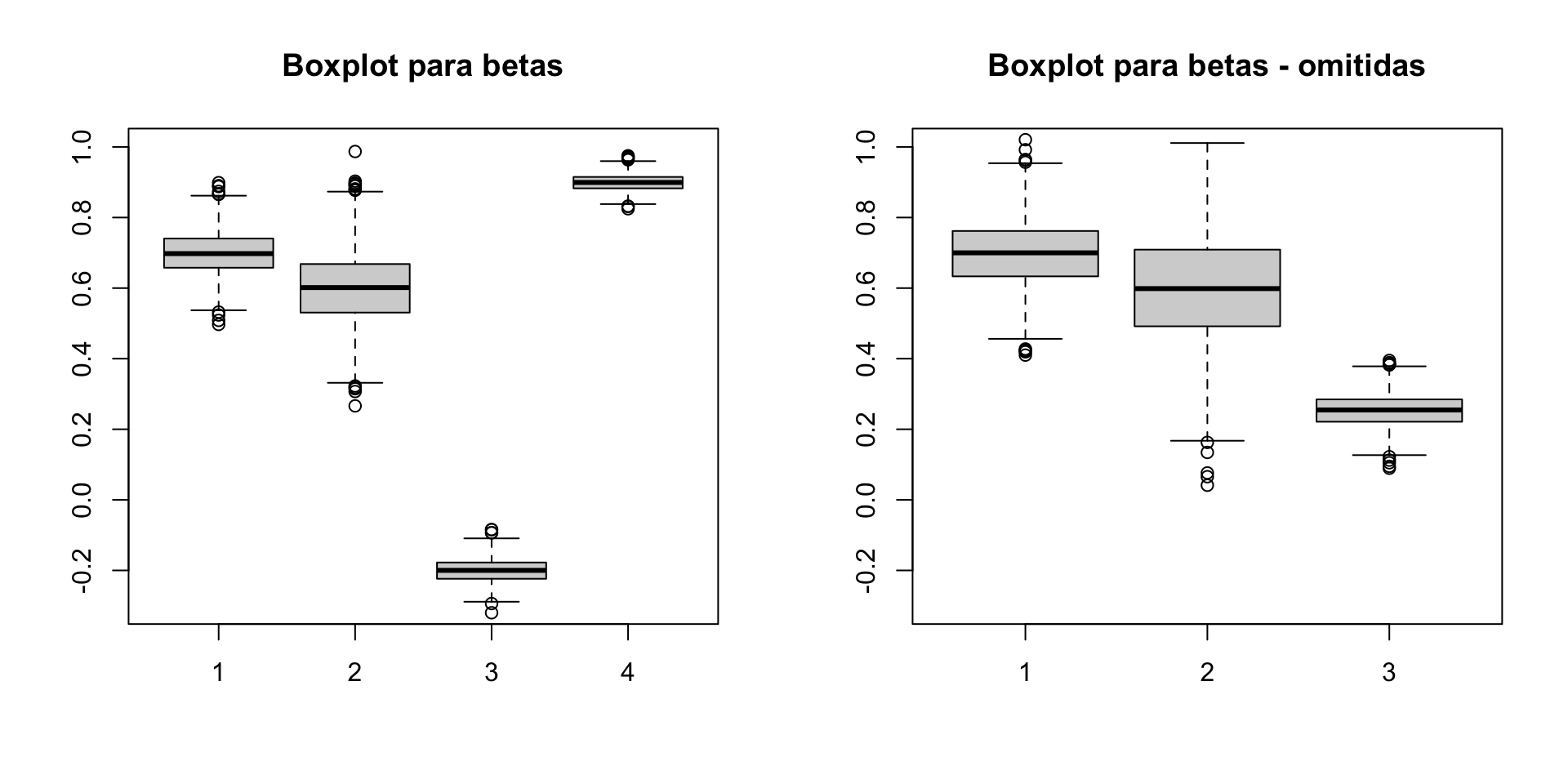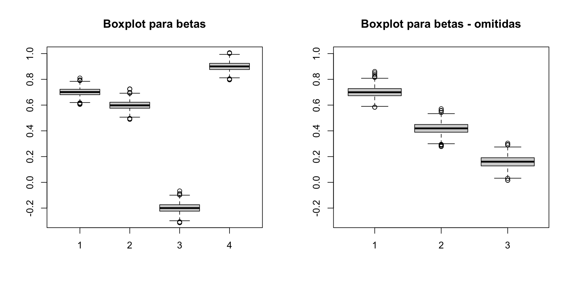 library(MASS)n <-1000betas <-matrix(NA, ncol =4, nrow =1000)betas_o <-matrix(NA, ncol =3, nrow =1000)for (i in1:1000) { u <-rnorm(n) x <-mvrnorm(n, mu =c(0,0,0), Sigma =matrix(c(1, 0, 0, 0, 1, 0, 0, 0, 1), 3, 3)) x1 <- x[,1] x2 <- x[,2] x3 <- x[,3] y <-0.7+0.6*x1 -0.2*x2 +0.9*x3 + u betas[i, ] <-coef(lm(y ~ x1 + x2 + x3)) betas_o[i, ] <-coef(lm(y ~ x1 + x2))}par(mfrow =c(1, 2))boxplot(betas, ylim =c(-0.3, 1))title("Boxplot para betas")boxplot(betas_o, ylim =c(-0.3, 1))title("Boxplot para betas - omitidas")