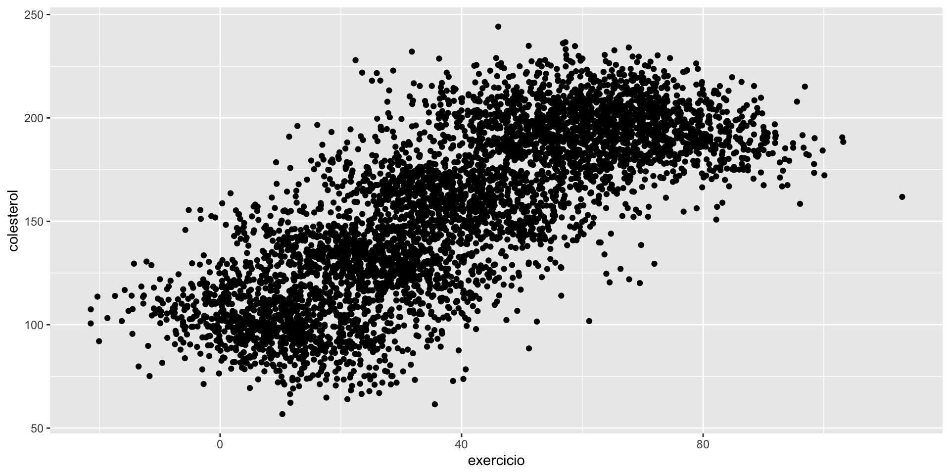 Considere um estudo que mede a quantidade média de exercícios diário (em minutos) e o nível de colesterol LDL (mg/dL). Baseado no seguinte gráfico de dispersão, quais seriam suas conclusões?