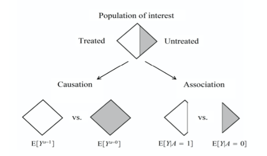 Usualmente, comparamos o resultado quando uma determinada ação A é realizada versus o resultado quando a ação A não é realizada. Se o resultado muda, dizemos que a ação A tem um efeito causal sobre o resultado. Caso contrario, dizemos que ação A não tem um efeito causal sobre o resultado. A ação A é geralmente chamada de intervenção, política ou tratamento.