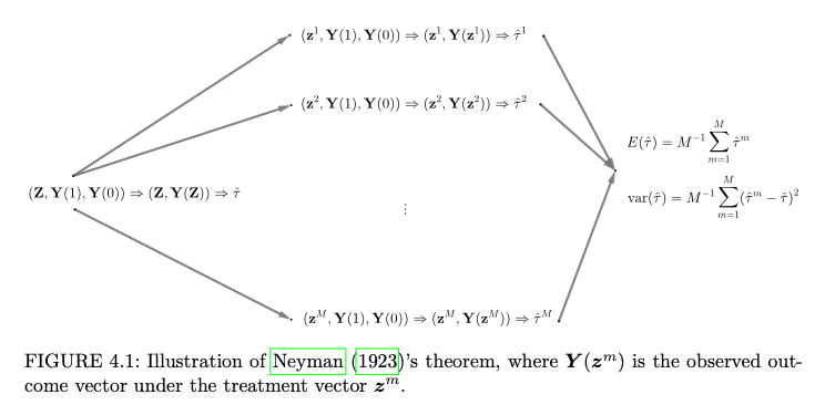 Considere um CRE com \(n\) unidades, em que \(n_1\) recebem o tratamento e \(n_0\) recebem o placebo. Para cada \(i\) (\(i = 1, \cdots, n.\)) temos os resultados potenciais \(Y_i(1)\) e \(Y_i(0)\), bem como o efeito causal individual \(\tau_i = Y_i(1) - Y_i(0)\). Então: