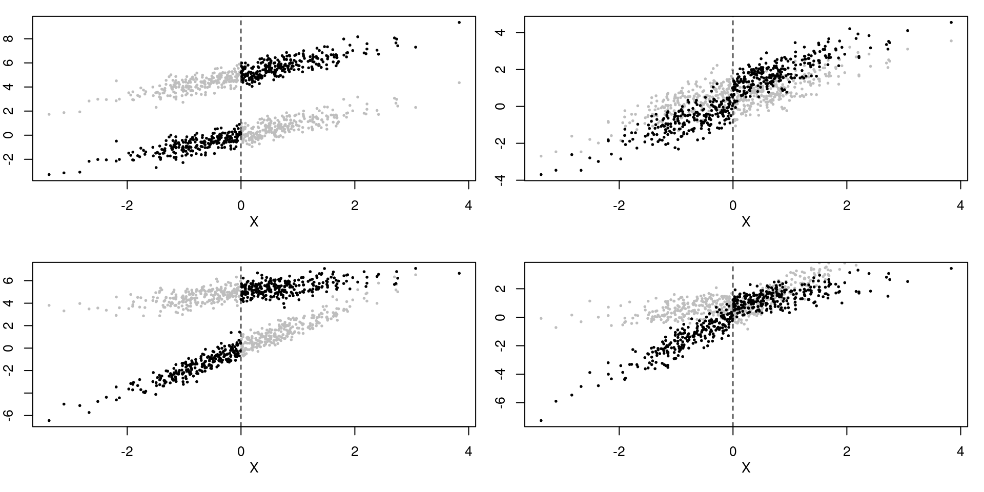 De forma semelhante, se \(\mathbb{E}[Y(0) | X = x]\) for contínuo pela esquerda em \(x_0\), \[\mathbb{E}[Y(1) | X = x_0] = \lim_{\epsilon \rightarrow 0^{+}} \mathbb{E}[Y | Z = 0, X = x_0 - \epsilon].\]