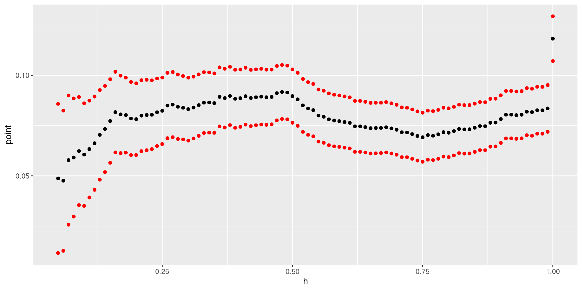 library(ggplot2)dados <-data.frame(h = hh, point = local_regression[, 1], int_inf = local_regression[, 2], int_sup = local_regression[, 3])ggplot(data = dados) +geom_point(aes(x = h, y = point)) +geom_point(aes(x = h, y = int_inf), color ="red") +geom_point(aes(x = h, y = int_sup), color ="red")